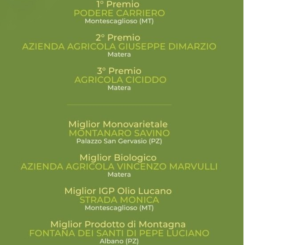 La premiazione è avvenuta giovedì 22 gennaio presso la Sala Convegni “Gaetano Michetti” della Azienda Agricola Sperimentale Dimostrativa Pantanello a Metaponto nel corso di una giornata di studi ed approfondimenti sul settore. Oltre alla proclamazione dei vincitori, i primi tre classificati, sono state assegnate le menzioni speciali “Mono-varietale”, “Biologico”, “Dop Vulture”, “Igp Olio Lucano”, “Prodotto di Montagna”